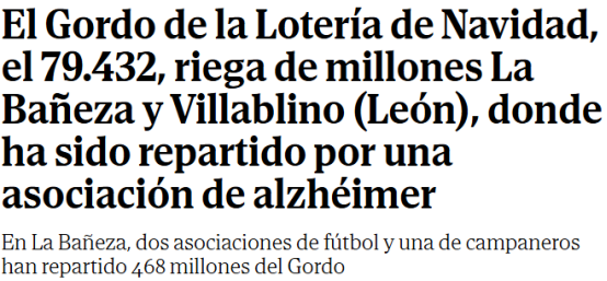 今年幸运之神眷顾莱昂省,尤其是拉巴涅萨市。该市位于主教阿尔科莱亚广场的1号彩票销售点售出了117套头奖彩票。