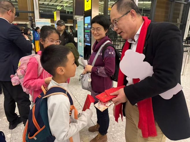 中国驻伦敦旅游办事处主任张力给随家人去中国探亲过年的华裔孩子在登机口前派发新春红包。(图片来源:欧洲时报 余梁意摄)